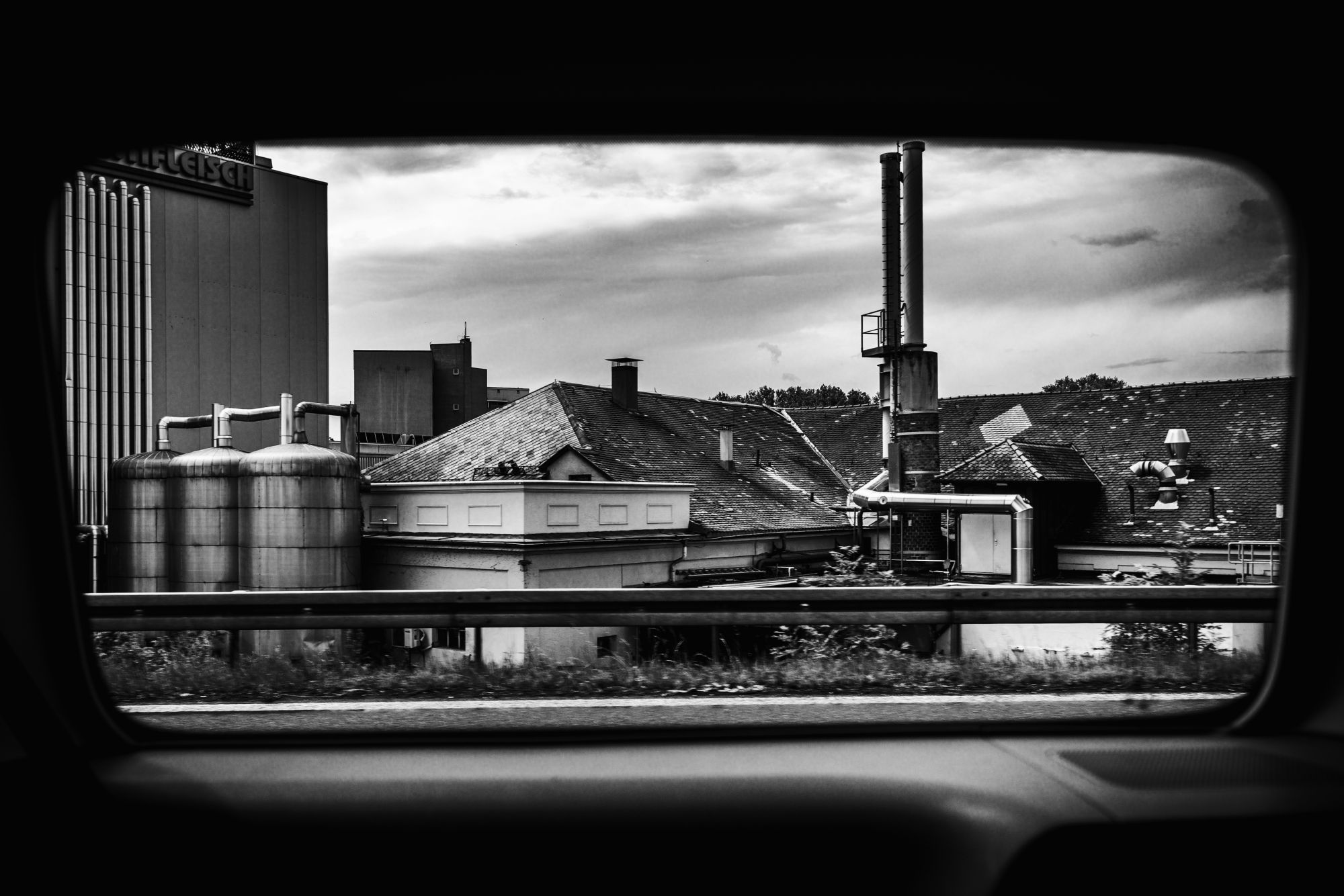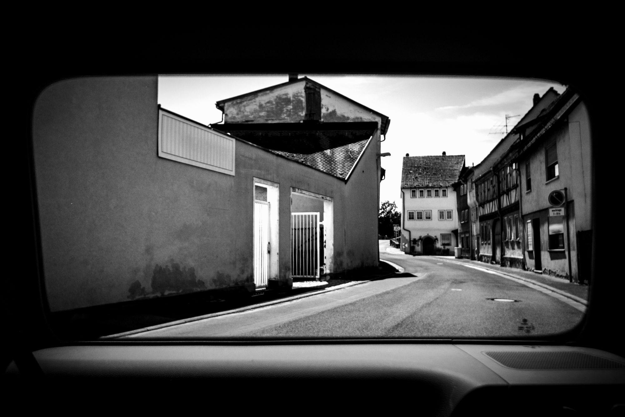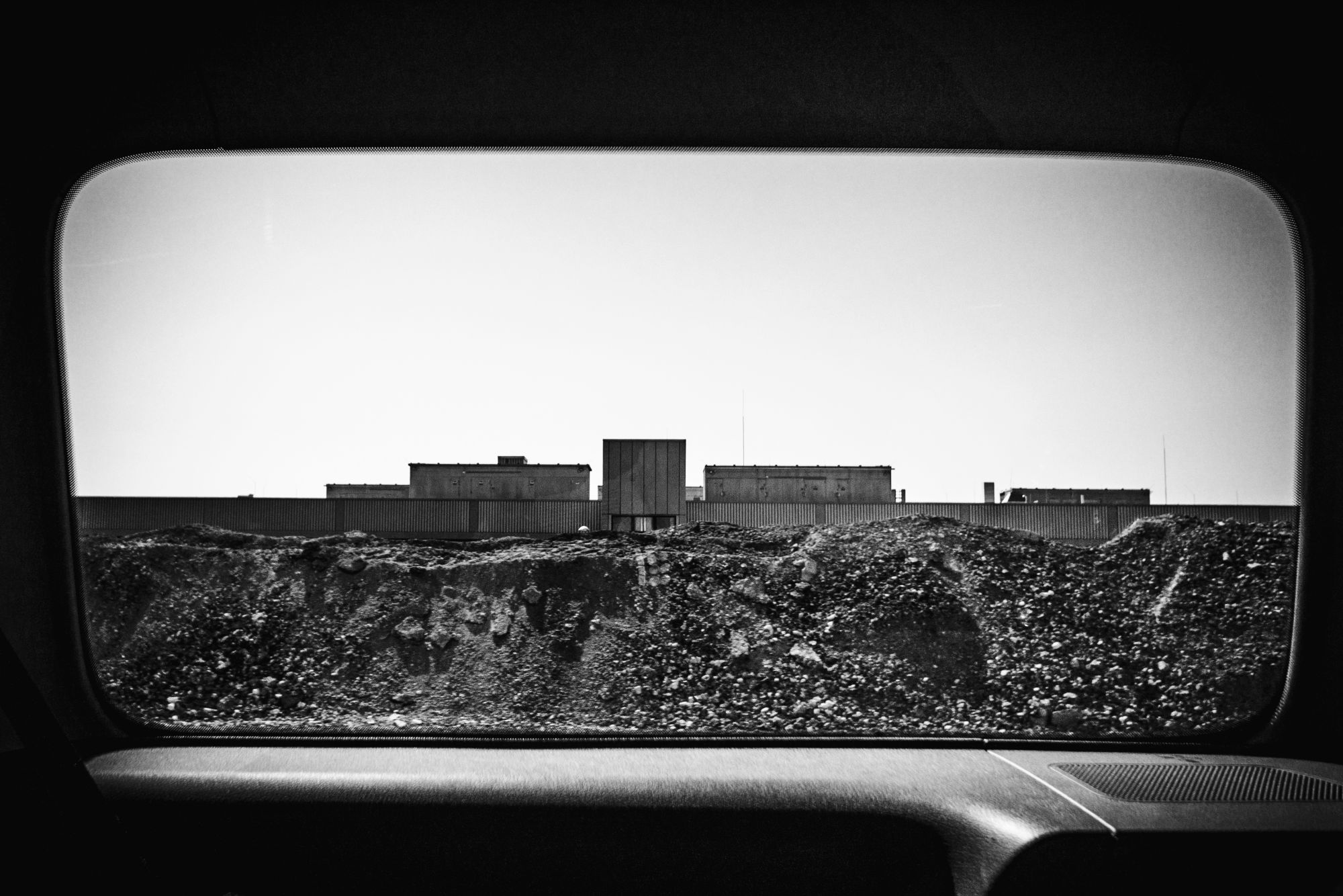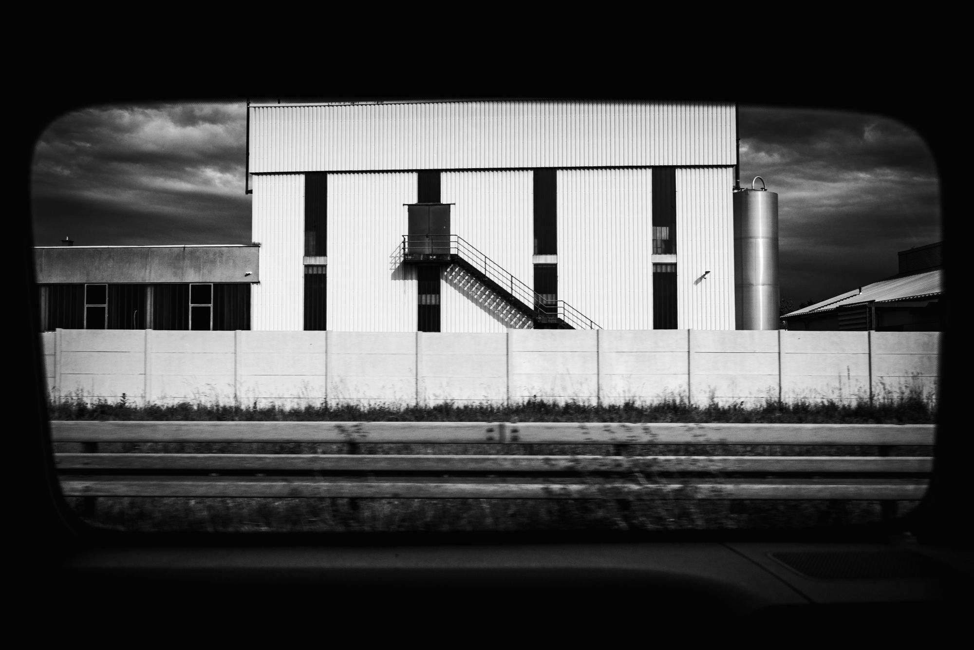 Architecture marks the edges of movement. Houses, factories, facades, and utilitarian structures appear only for a moment, framed by the constant outline of the car window. What normally stands still becomes temporary: a brief encounter between form, distance, and speed.