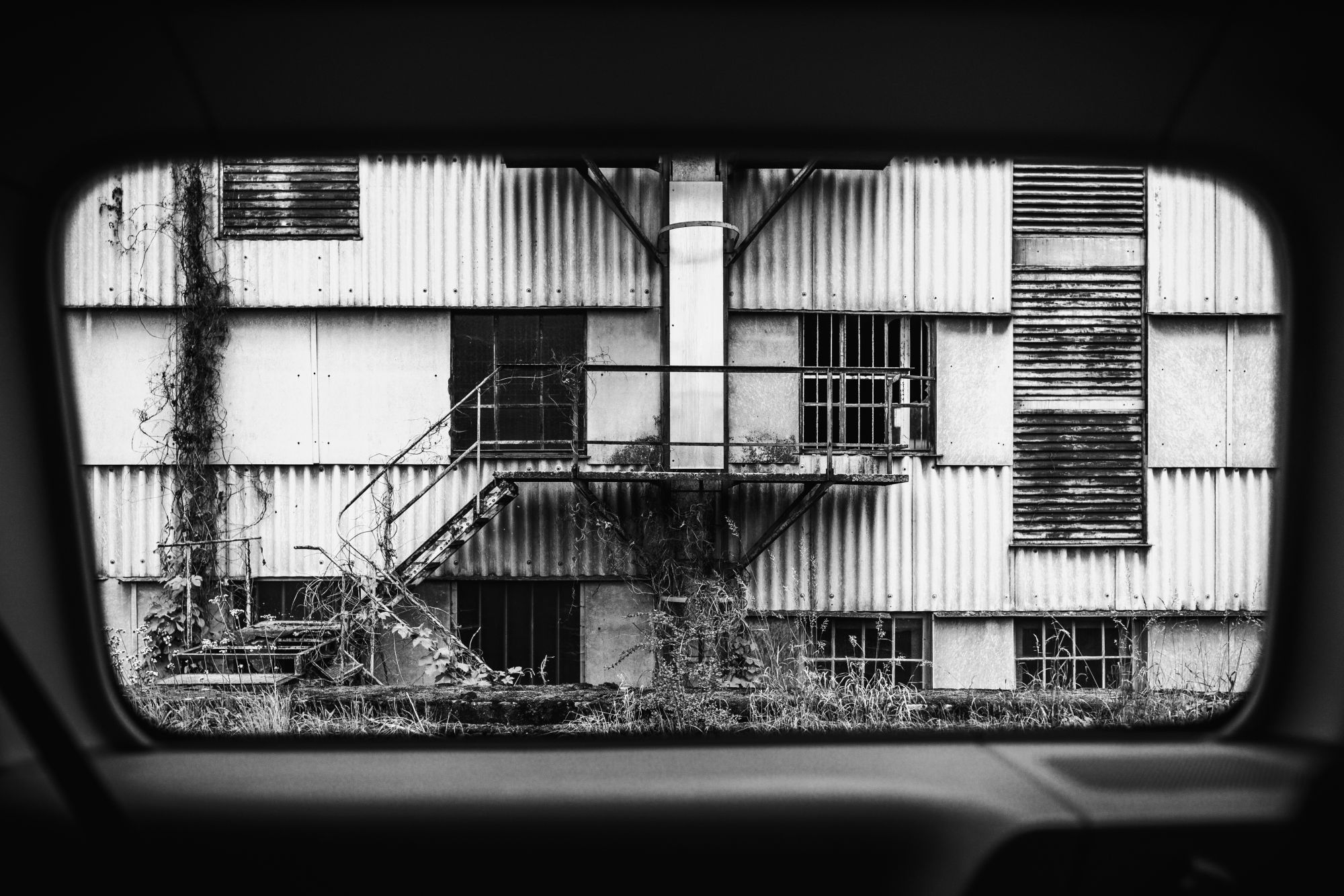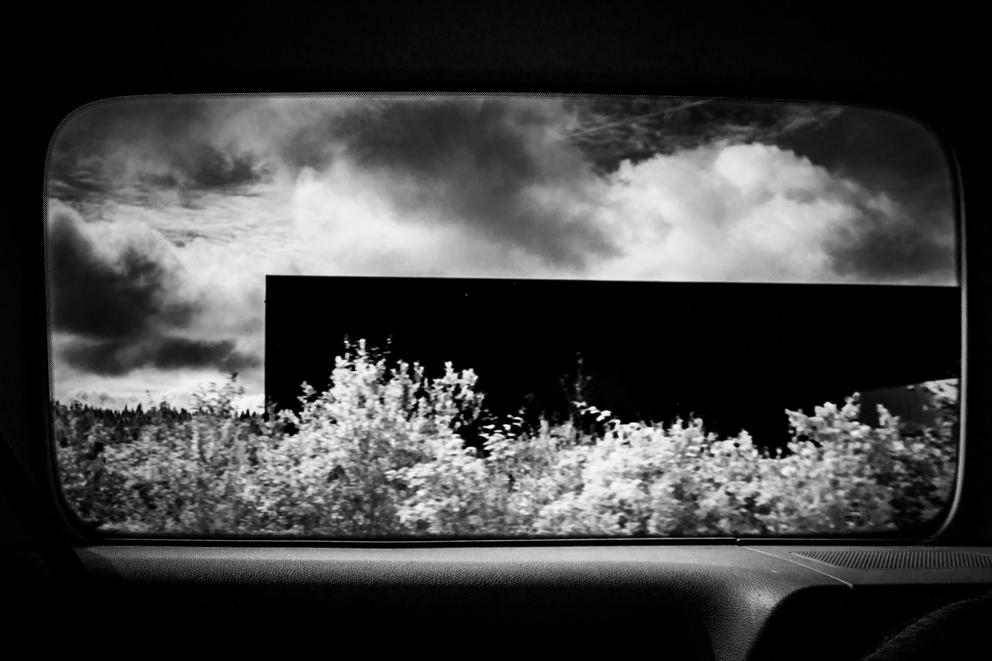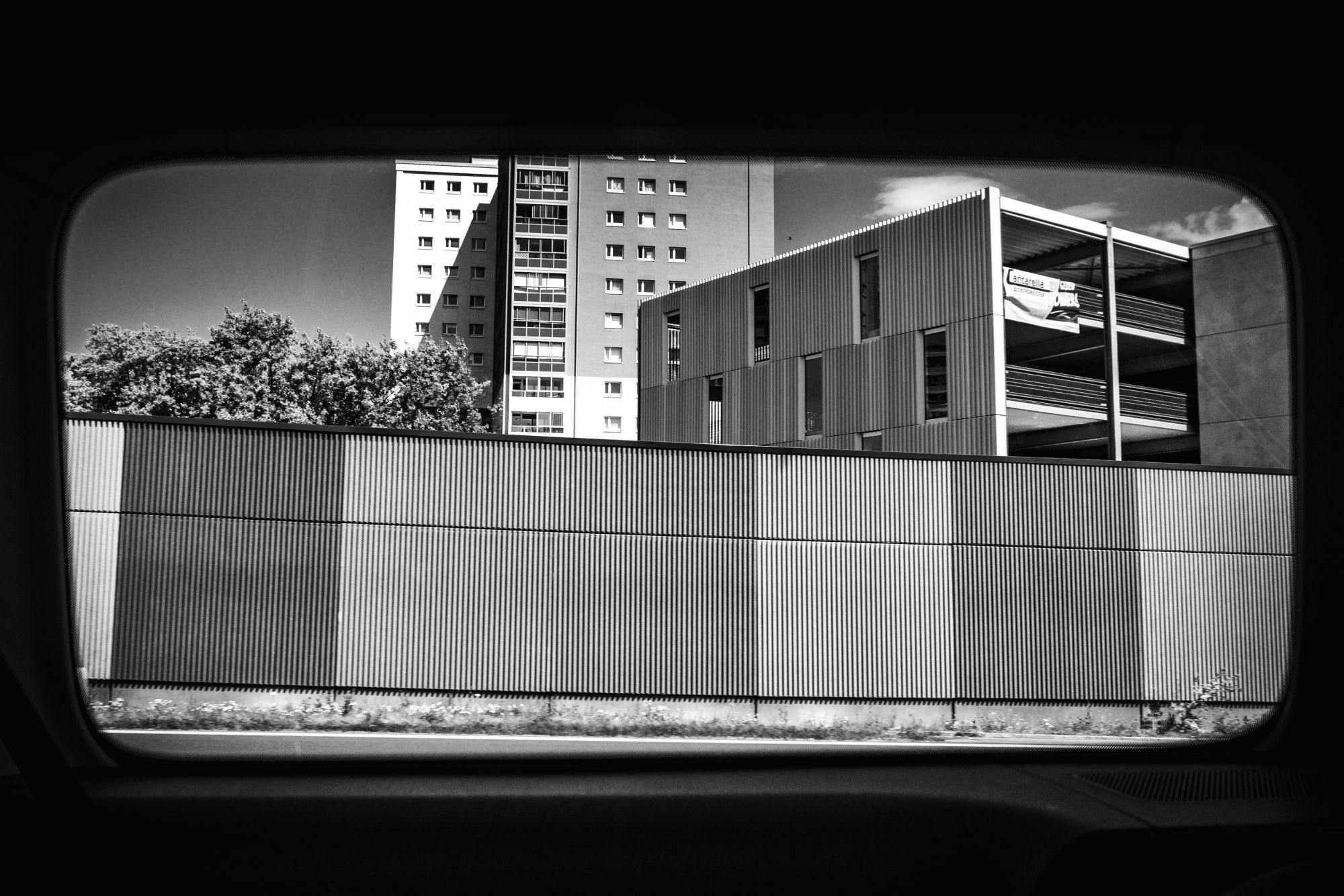 Architecture marks the edges of movement. Houses, factories, facades, and utilitarian structures appear only for a moment, framed by the constant outline of the car window. What normally stands still becomes temporary: a brief encounter between form, distance, and speed.