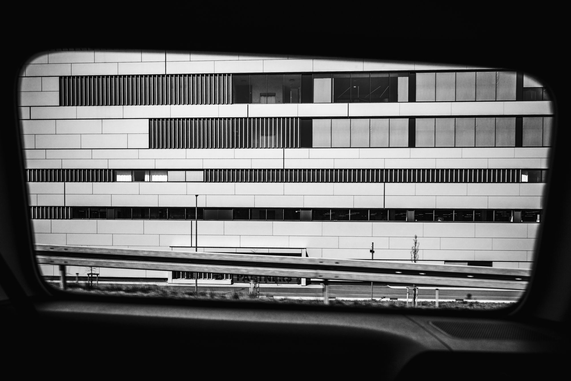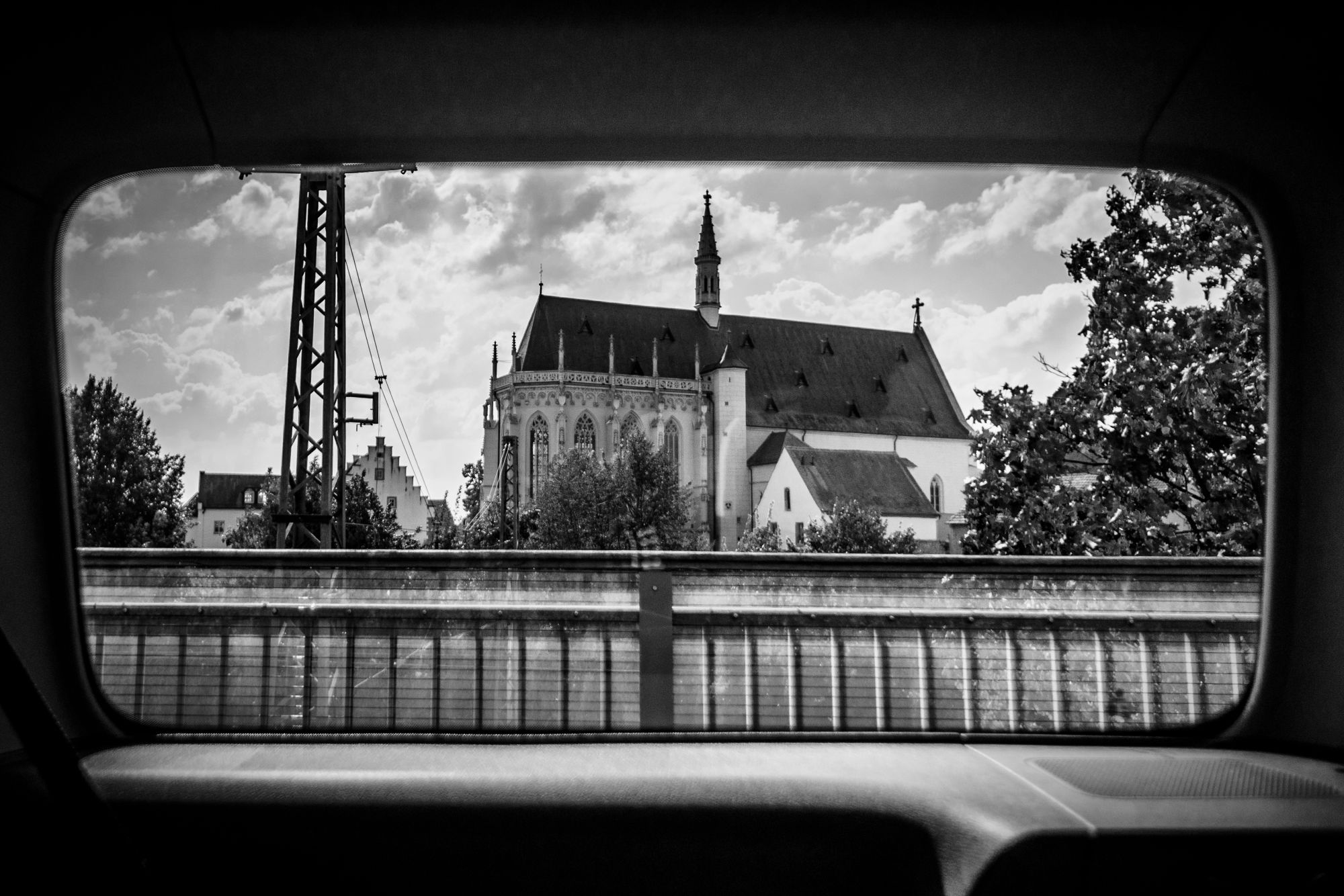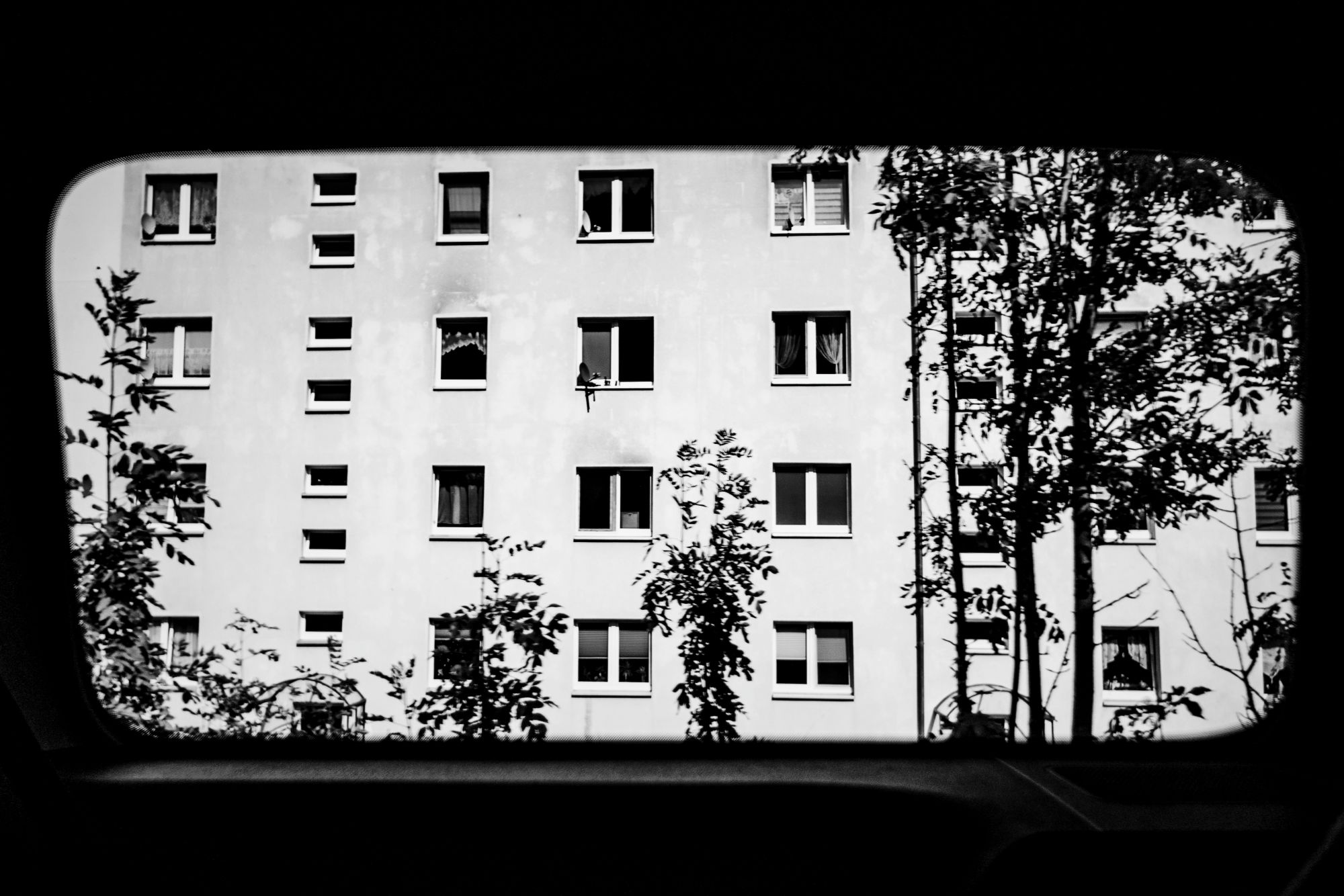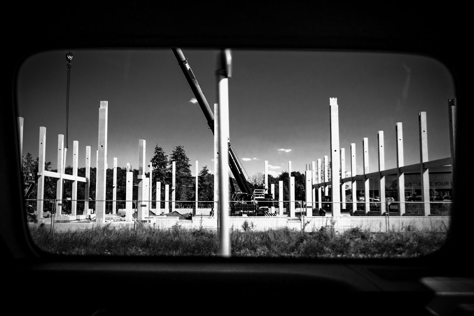 Architecture marks the edges of movement. Houses, factories, facades, and utilitarian structures appear only for a moment, framed by the constant outline of the car window. What normally stands still becomes temporary: a brief encounter between form, distance, and speed.